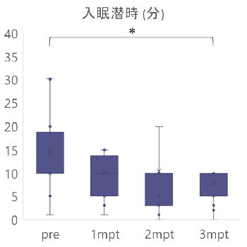 通年性の冷えに悩む成人女性19名(平均年齢42.6±7.5歳)を対象として、家庭での重炭酸温浴による入眠潜時(ベッドに入ってから寝付くまでの時間)を検証しました。1日20分、3ヵ月間毎日の重炭酸温浴により、入眠潜時は有意に改善しました(第84回日本温泉気候物理医学会学術総会 2019)。