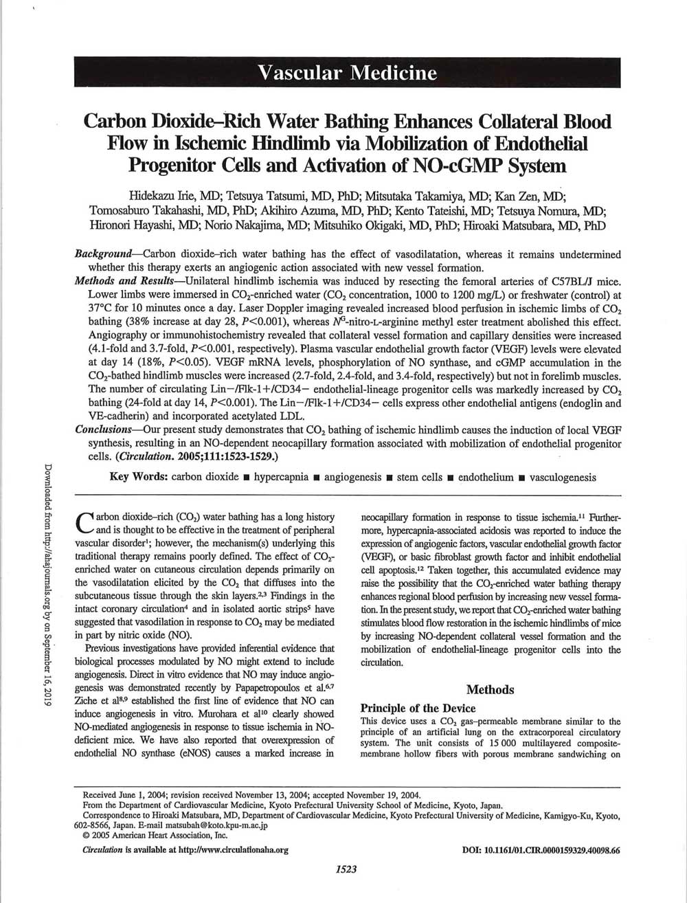 - 重炭酸入浴により、重炭酸イオンが血管内に浸透して血管内皮細胞内酵素eNOSに作用。NO産生を活性化、虚血肢の血流を改善(マウス実験による)。