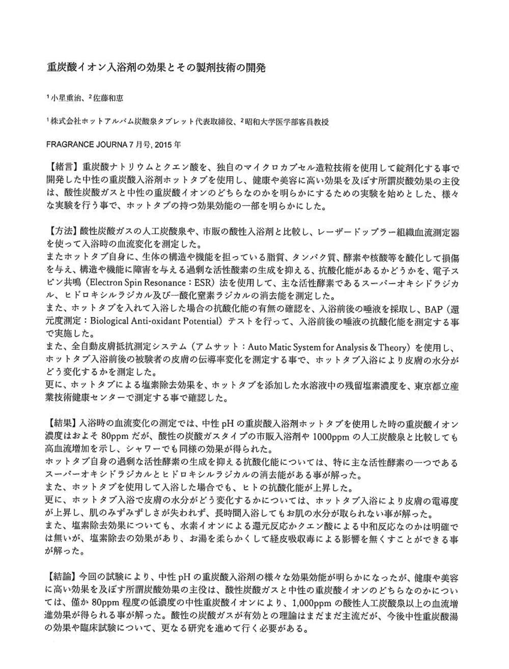 - 被験者(健常成人女性19名)に対して、家庭用重炭酸入浴剤(ホットタブ)による重炭酸温浴を実施。寺澤変法及びVASスケールによる冷えレベル、ピッツバーグ睡眠質問票による睡眠の質レベルを評価、冷え及び睡眠の質ともに優位な改善を確認。