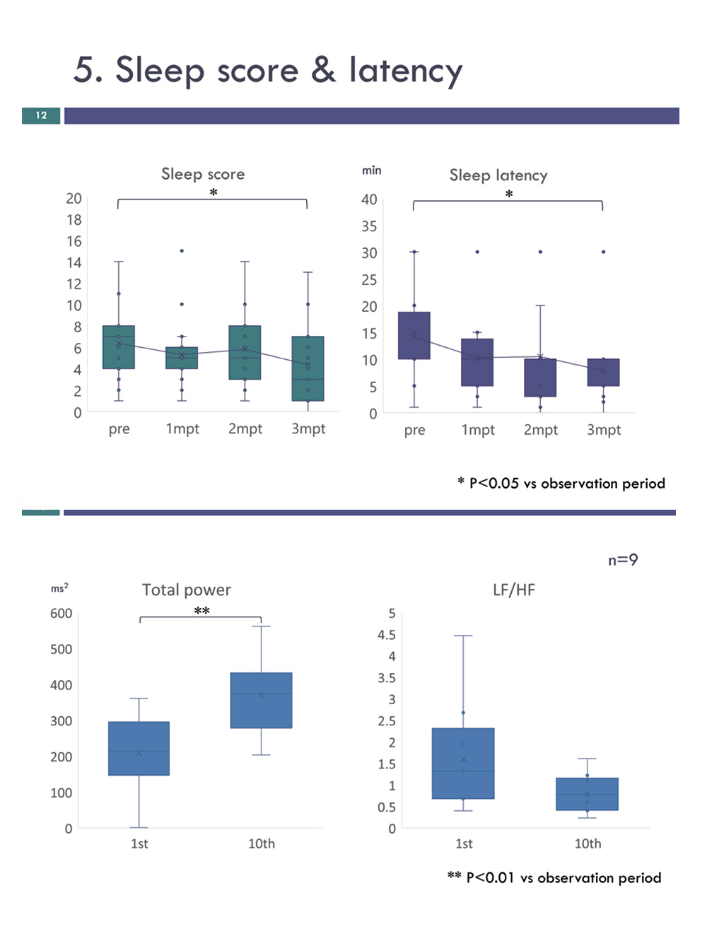 - ヒトにおける重炭酸入浴による睡眠の質、ストレス、免疫機能に関する効果を評価。睡眠の質については、ピッツバーグ睡眠質問票による主観的評価と、活動計装着による客観的計測を実施。また、企業に義務付けられた従業員への職業性ストレスチェック調査票評価を実施して、重炭酸温浴により睡眠の質及びストレスの改善を確認。